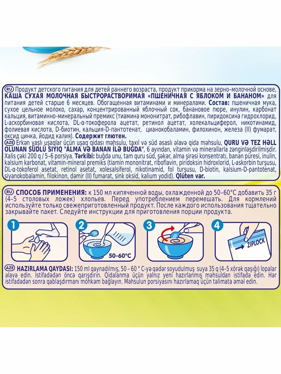 | Состав | пшеничная крупа 43 %, цельное сухое молоко 33 %, сахар, сгущенный яблочный сок 5,8 %, сгущенный банановый сок 4,4 % (сироп глюкозы, фруктоза, сгущенный сок банана), витамины (ретинола ацетат, холекальциферол, токоферола ацетат, тиамина гидрохлорид, рибофлавин, пиридоксина гидрохлорид, аскорбиновая кислота, кальция пантотенат, фолиевая кислота, никотинамид, фитоменадион, цианокобаламин) и минеральные вещества (дифосфат железа, йодид калия) |