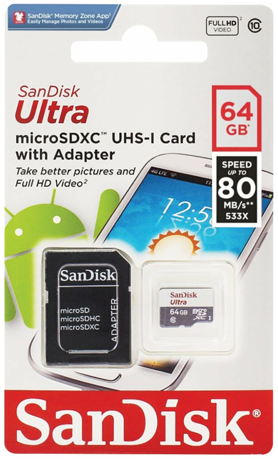 Ниже Вы можете прочитать отзывы на Карта памяти microSD 64ГБ Sandisk Ultra Class 10 UHS-I 80MB/s + SD adapter (SDSQUNS-064G-GN3MA), ознакомится с подробными характеристиками, посмотреть интересные обзоры и фотографии на Карта памяти microSD 64ГБ Sandisk Ultra Class 10 UHS-I 80MB/s + SD adapter (SDSQUNS-064G-GN3MA).