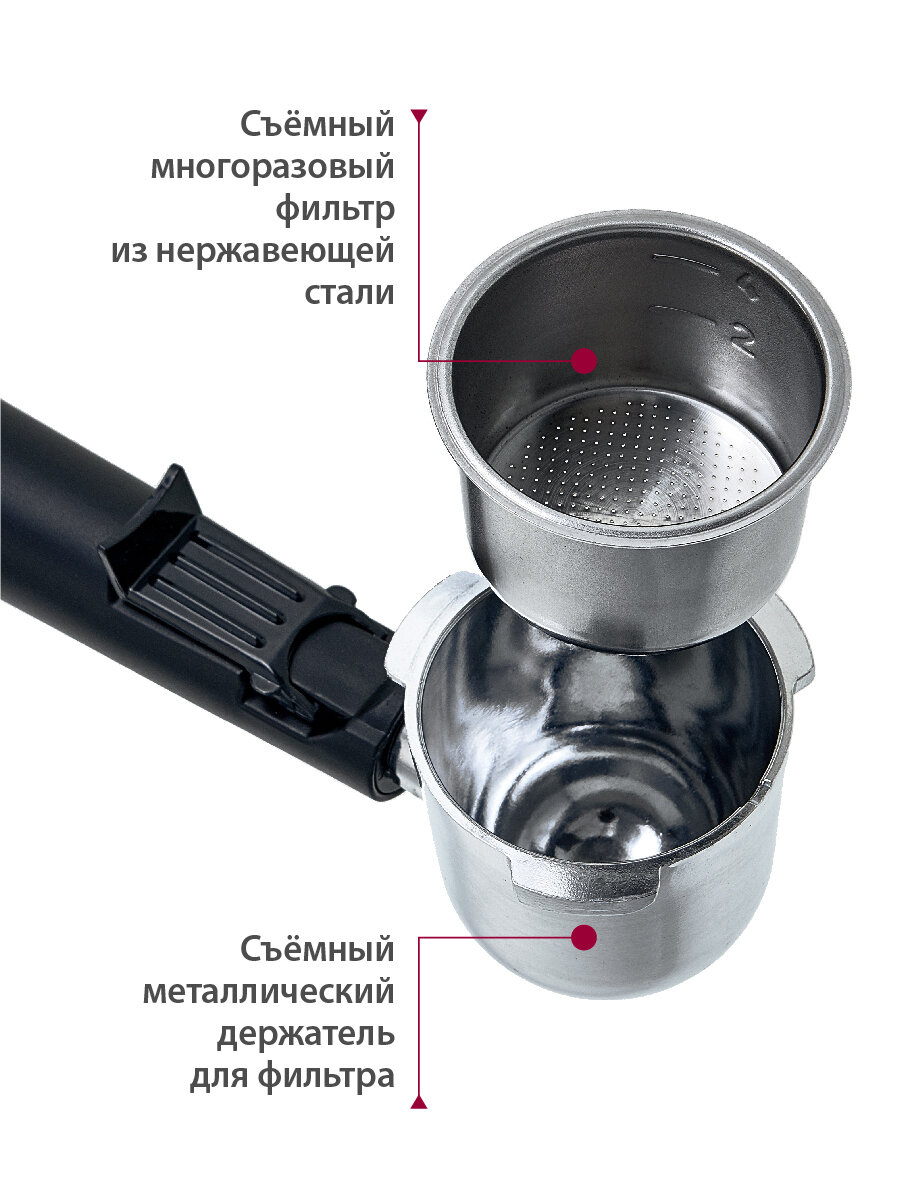 | Минусы: | Недостаточная герметичность из-за чего пар при приготовлении травит через соединение фильтра и кофеварки