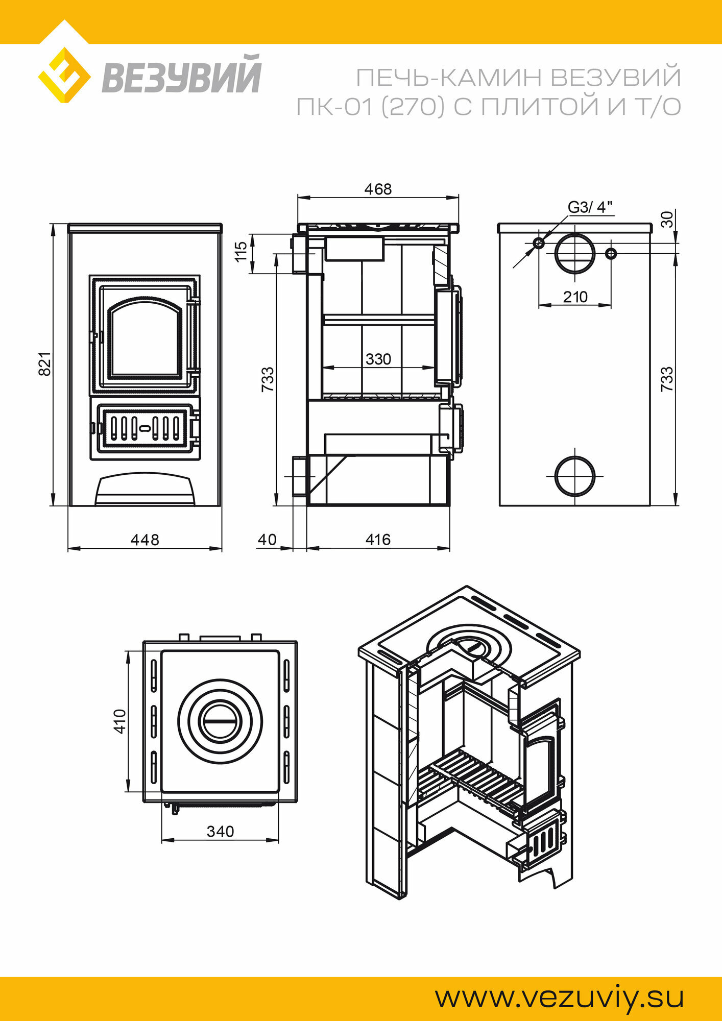 Печь-Камин везувий ПК-01 (270) с плитой и теплообменник (беж.) 9 кВт