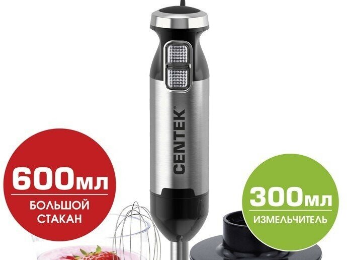 Блендер Centek CT-1337, 1000Вт, DC мотор, стальная насад, стакан 600мл, чоппер, венчик, черный