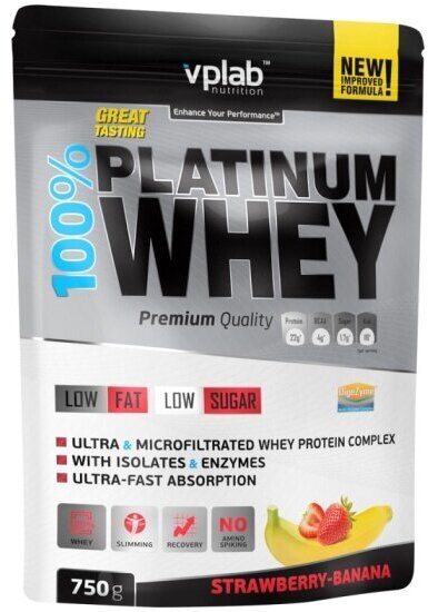 VPLab Nutrition Сывороточный протеин 100% Platinum Whey, вкус «Клубника-банан», 750 г, VPLab