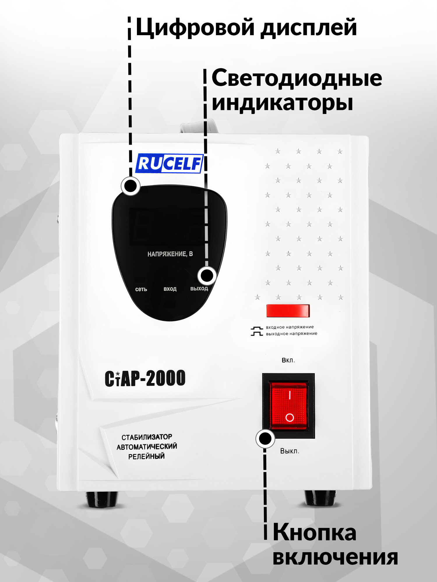 Стабилизатор напряжения однофазный RUCELF СтАР-2000 белый 2000 ВА 1400 Вт 180 мм 290 мм 210 мм 5.5 кг 2 шт.
