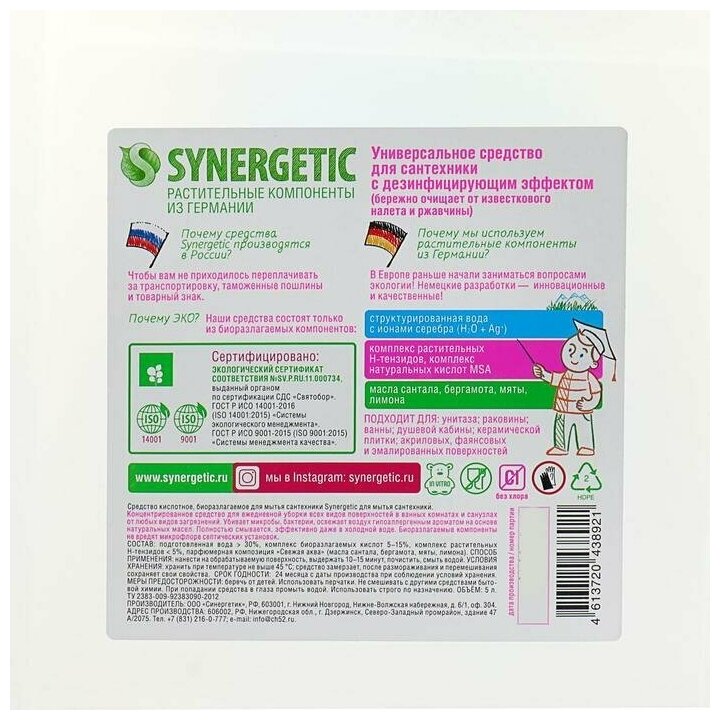 Средство для мытья сантехники Synergetic 5л 1088086 Synergetic .
