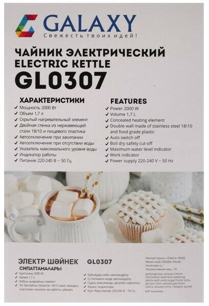 GALAXY GL 0307 белый Чайник электрический 2000Вт, объем 1,7л , скрытый нагревательный элемент, двойная стенка из нержавеющей стали 18/10 и пищевого пластика, автоотключение при закипании, автоотключение при отсутствии воды, силиконовые ножки для устойчиво