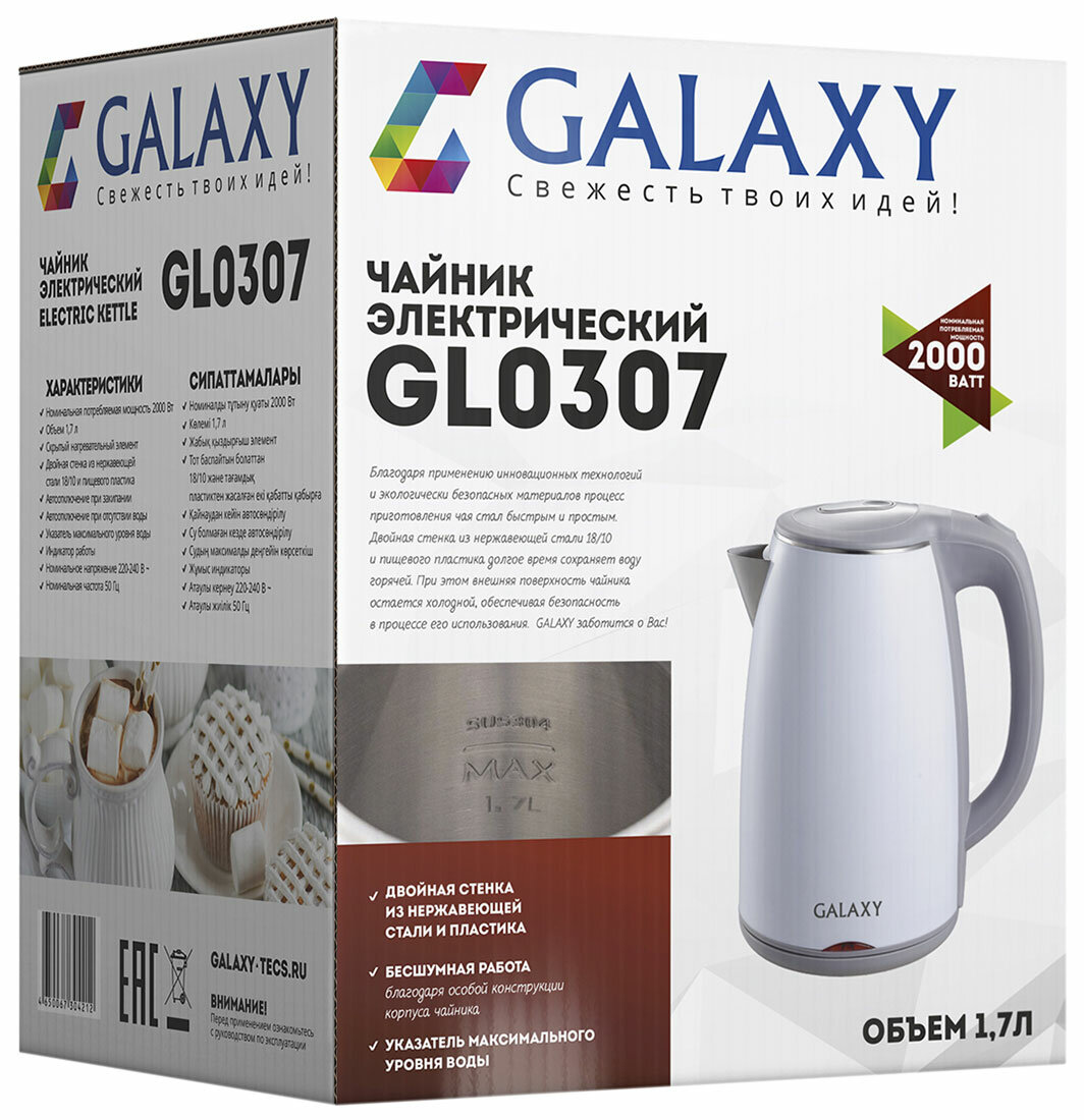 GALAXY GL 0307 белый Чайник электрический 2000Вт, объем 1,7л , скрытый нагревательный элемент, двойная стенка из нержавеющей стали 18/10 и пищевого пластика, автоотключение при закипании, автоотключение при отсутствии воды, силиконовые ножки для устойчиво