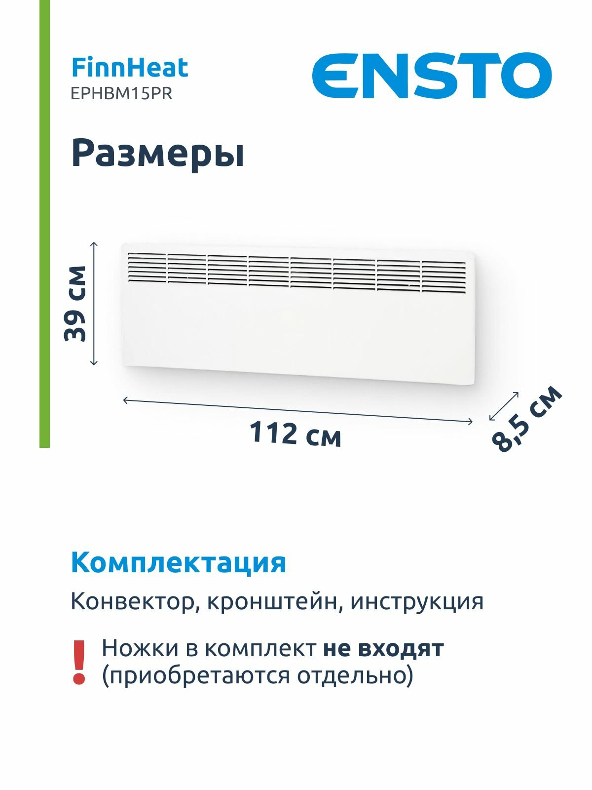 Конвектор FinnHeat EPHBM15PR IP21 1500Вт механический термостат 85*389*1121 (Ш*В*Д) ENSTO