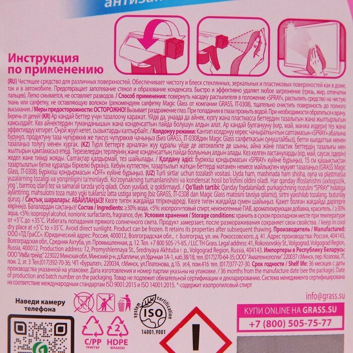 | Отзыв: | Обычный спрей для мытья стёкол, брала потому что люблю продукцию Grass, но данный товар не удивил. Плюс любопытно было действительно ли он справляемая с запотеванием зеркал? Нет, не справляется. |