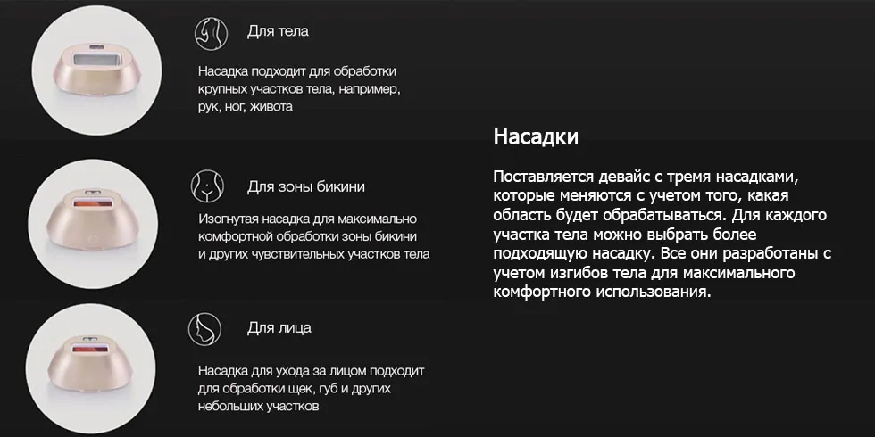 Хороший комплект: 3 насадки на разные участки тела, понятные инструкции. Оценивать эффект рано, так как нужно сделать около 4 процедур, а это два месяца. После двух по ощущениям рост волос стал медленнее. |