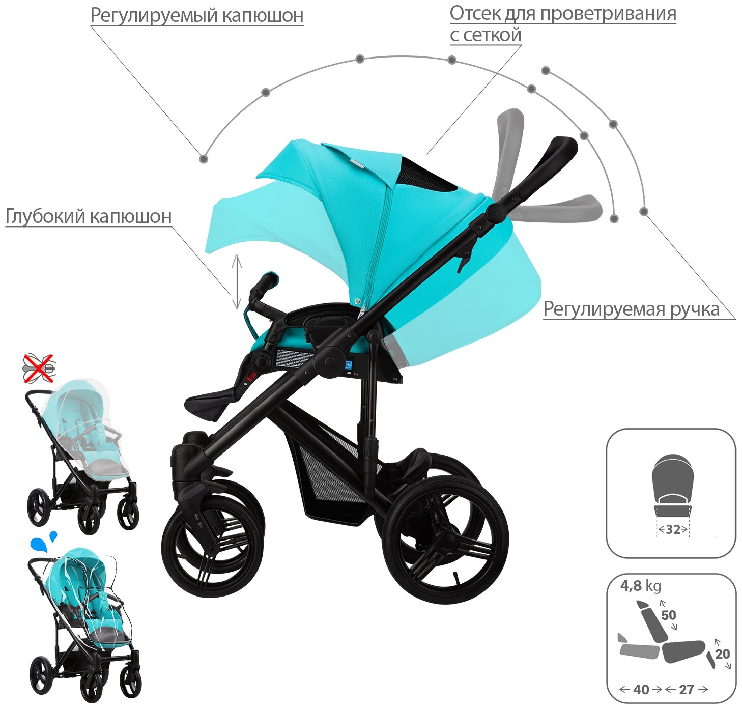 | Плюсы: | разнообразные цвета, хорошее исполнение, хорошо прошитые чехлы на сиденьях и капюшоне |