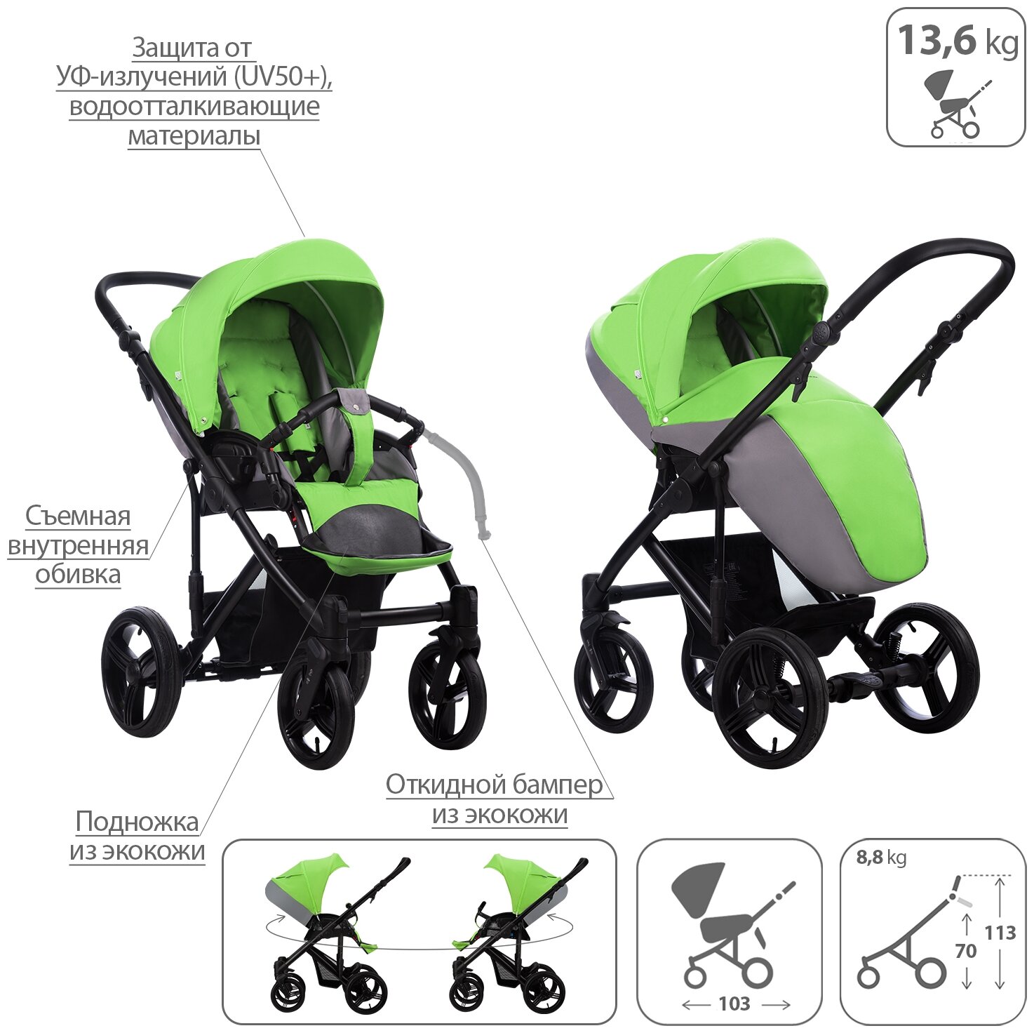 | Плюсы: | разнообразные цвета, хорошее исполнение, хорошо прошитые чехлы на сиденьях и капюшоне |