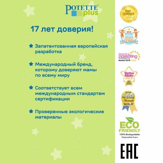 | Отзыв: | Ребёнок приучен к горшку с полутора лет, и теперь в поездки памперсы не беру. Пользуюсь сменными пакетами. Для дома купила силиконовую вкладку. |