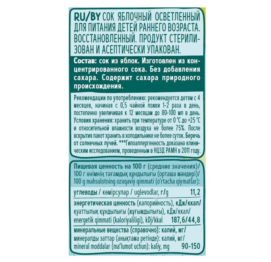 | Отзыв: | Вкусный сок,для питания детей раннего возраста. В составе только яблочный сок. Без добавления сахара. |