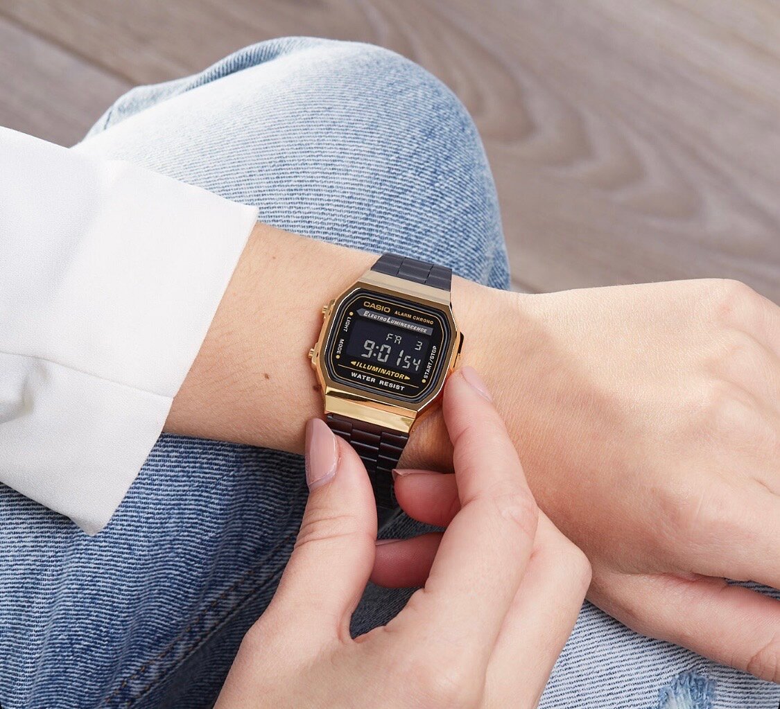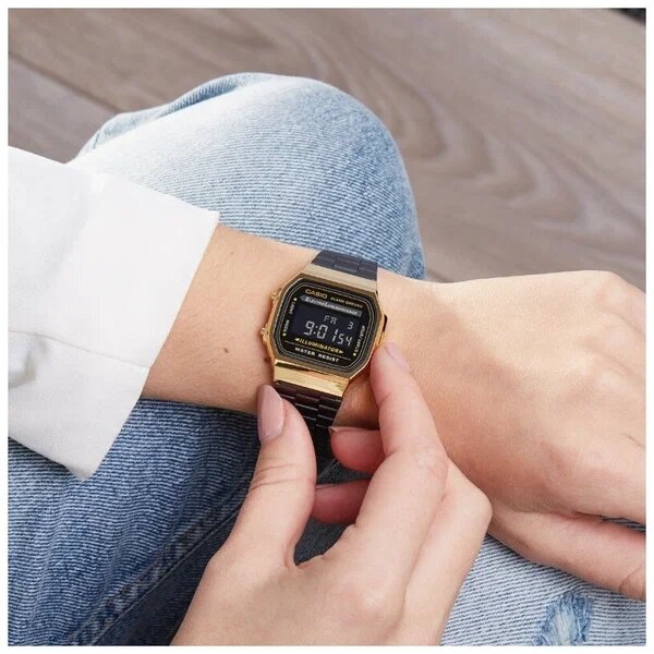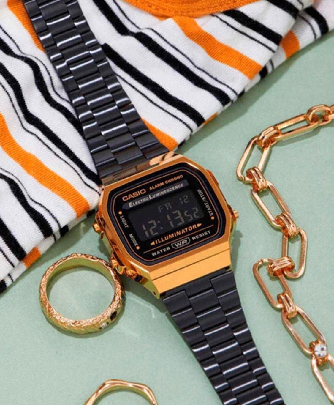 A168WEGG-1A Casio наручные часы кварцевые WR30 (3 атм) мужские, женские черный секундомер будильник отображение числа, отображение дня недели, отображение месяца подсветка дисплея акриловое стекло