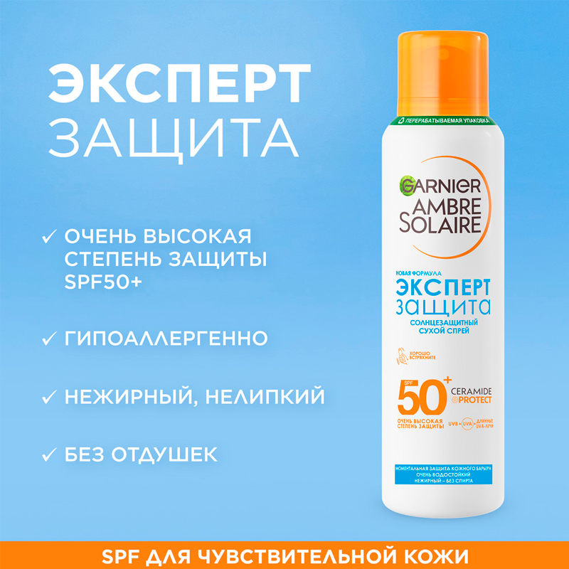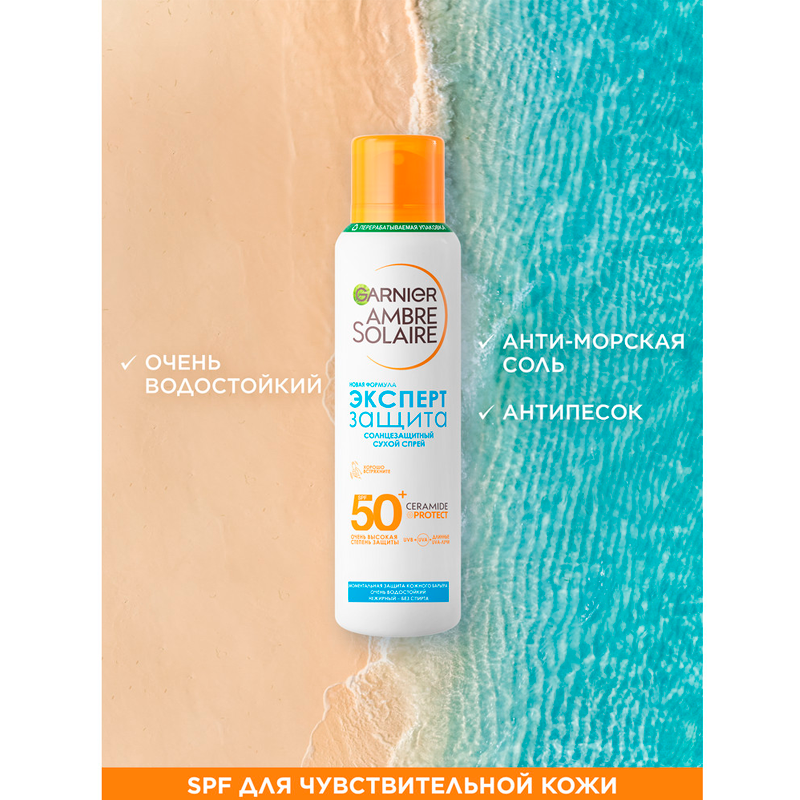 Garnier Ambre Solaire Солнцезащитный сухой спрей Эксперт Защита SPF 50+ для очень чувствительной кожи, 200 мл