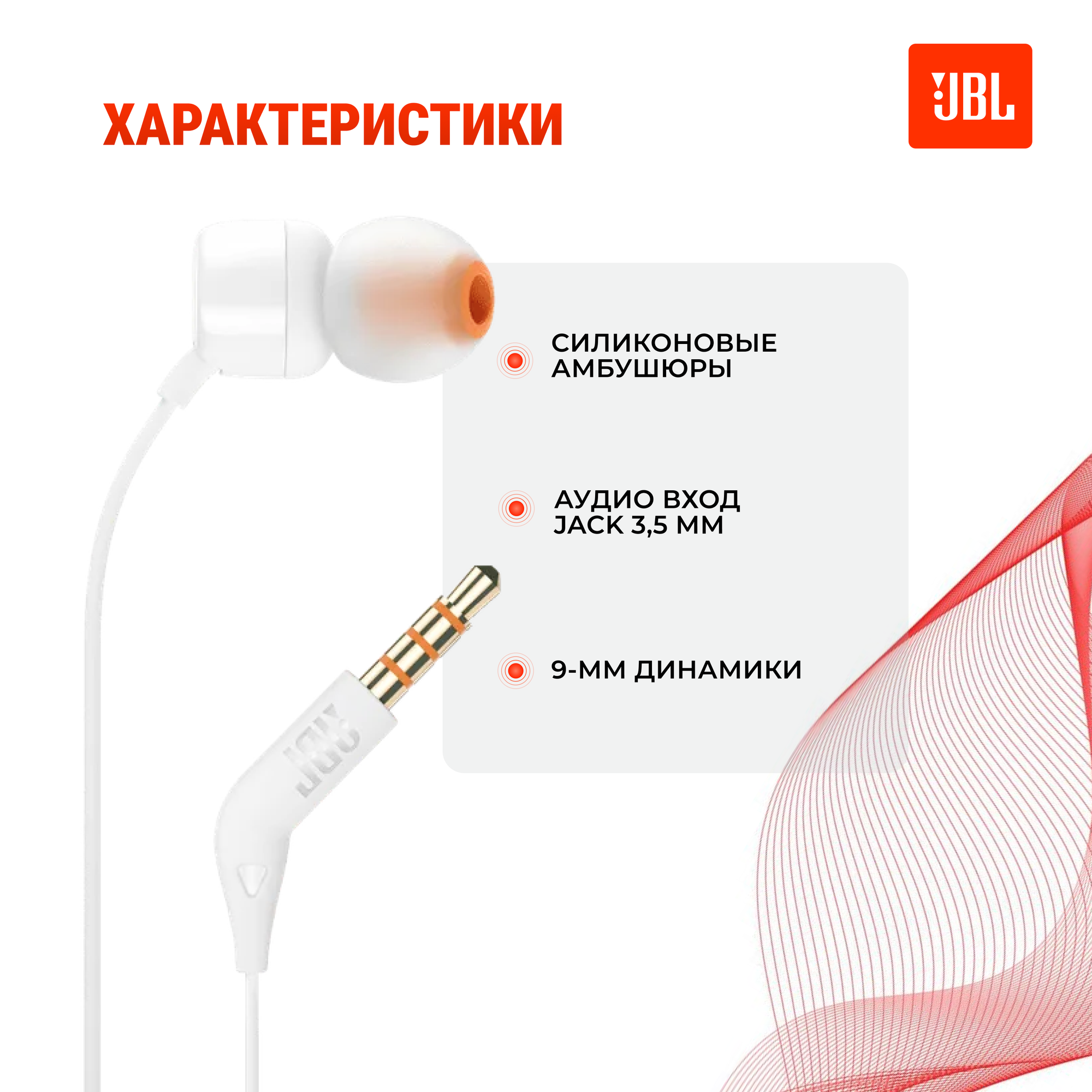Наушники JBL Tune 110, 3.5 мм, внутриканальные, белый [jblt110wht]