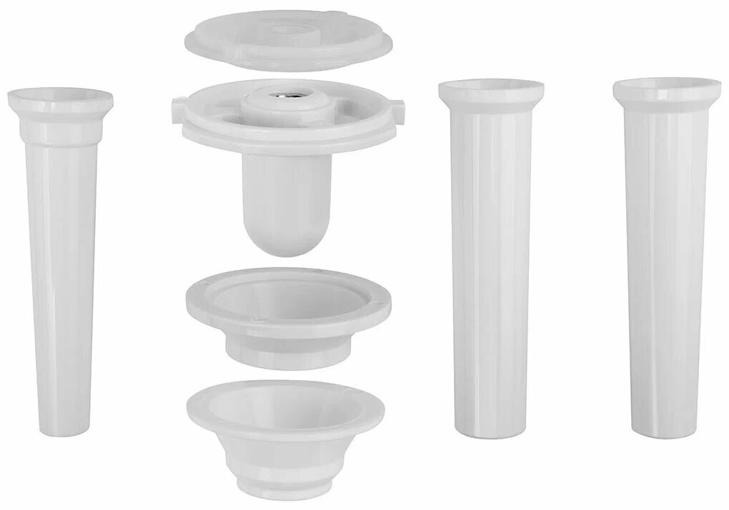 Работает достаточно тихо. Резиновые ножки компенсируют вибрацию. В комплекте набор для изготовления сосисок 3-х размеров, кеббе из фарша (что это не знаю) и собственно 3 диска 3, 5, 7 мм. Очень прикольное устройство для очистки дисков |
