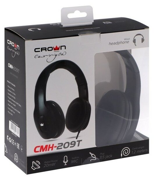 Купить Наушники CROWN CMH-209T, проводные, полноразмерные, с микрофоном, Jack 3.5 мм, 1.2 м, черные