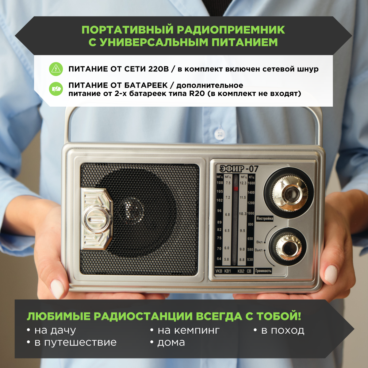Радиоприемник (эфир 07 FM 64-108МГц, бат. 2*R20, 220V)