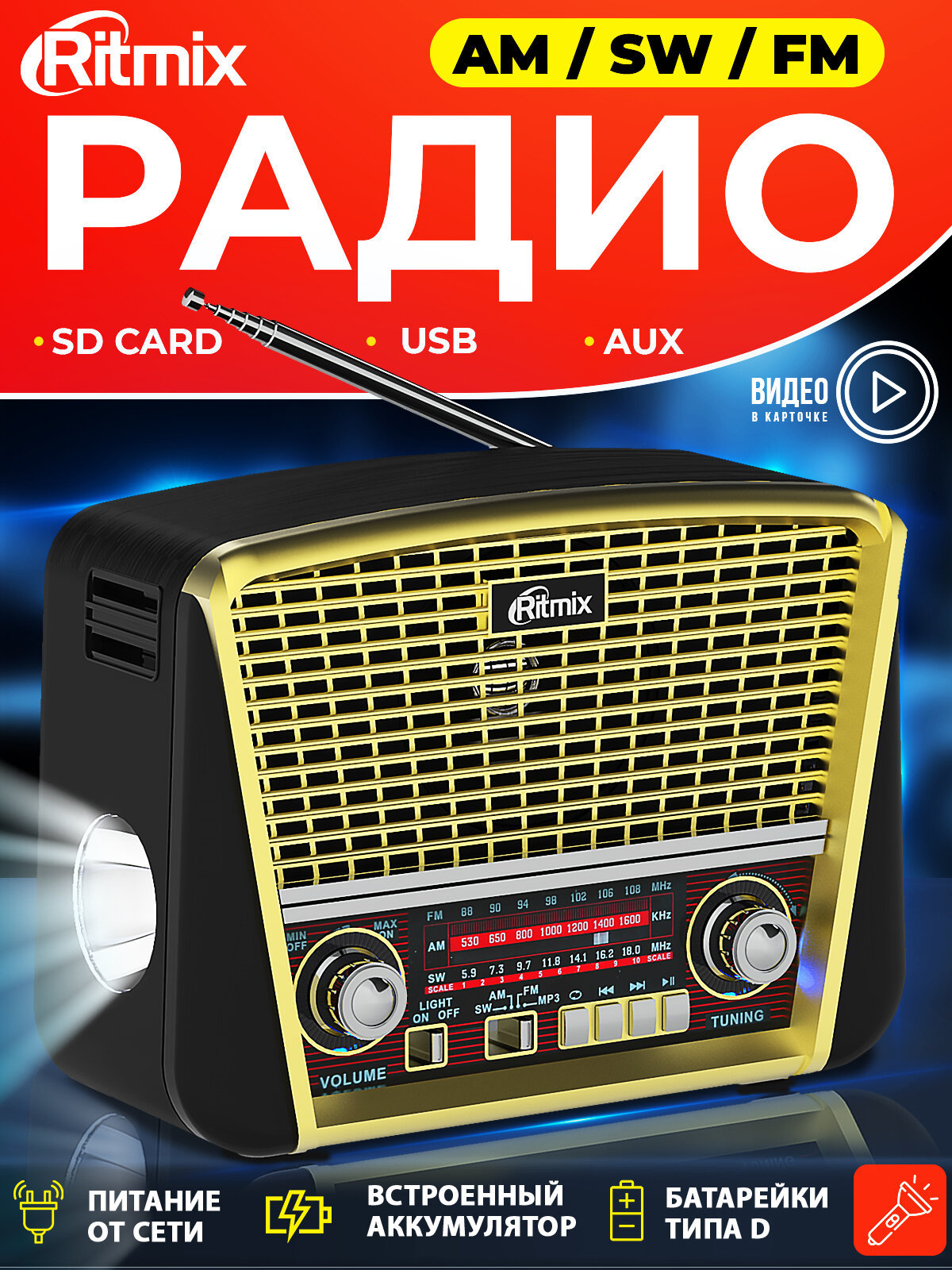 - Подсветка двух основных ручек (громкость и настройка). - Наличие встроенного аккумулятора. - Возможность работы от сети 220 В. - Встроенный фонарик, очень приятная опция. - Громкость динамика для прослушивания в комнате и на улице - великолепная. |
