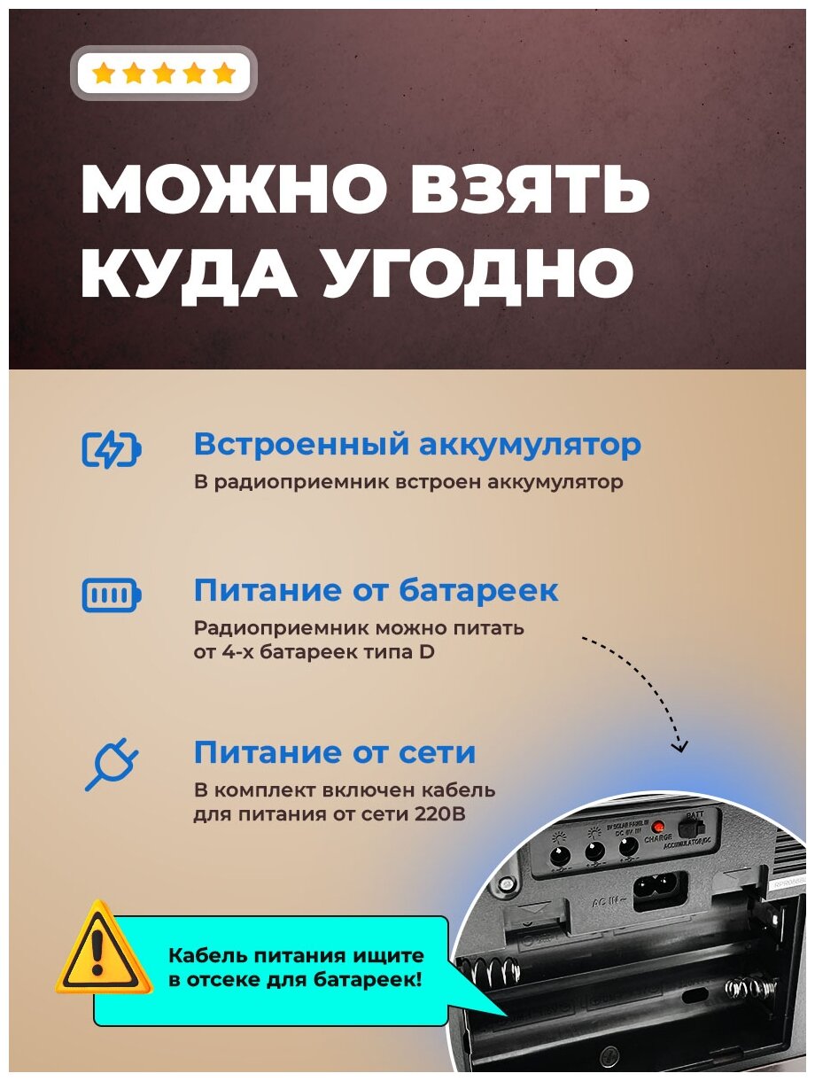| Плюсы: | Встроенный аккумулятор, работа от батареек, работа от сети. Аккумулятора хватает на 4-5 часов. Есть режим AUX. Mp3-плеер проигрывает треки из папок (где-то читал что читает только из корня накопителя). Кабель питания легко складывается в отсек для батареек. Зарядное устройство внутри приемника. |