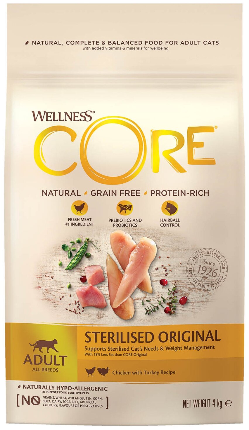 Сухой корм для стерилизованных взрослых кошек Wellness CORE Original, с курицей и индейкой 4 кг