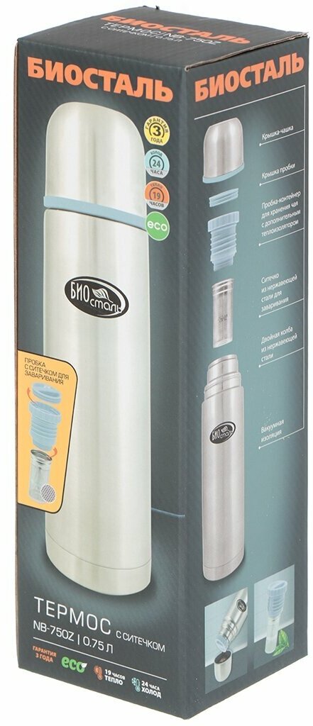 Термос классический Вакуумный с узкой горловиной, пробка-контейнер с ситичком Биосталь/Biostal (0.75),NB-750Z