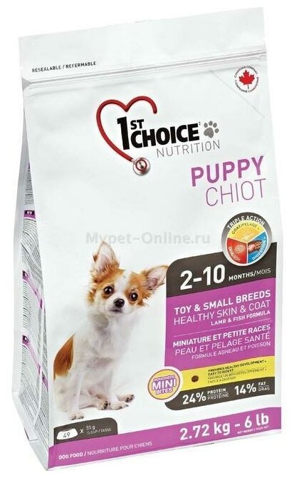 Корм 1st Choice PUPPY Toy & Small Breeds, Healthy Skin & Coat для щенков декоративных и малых пород, для кожи и шести, с ягненком и рыбой, 2.72 кг