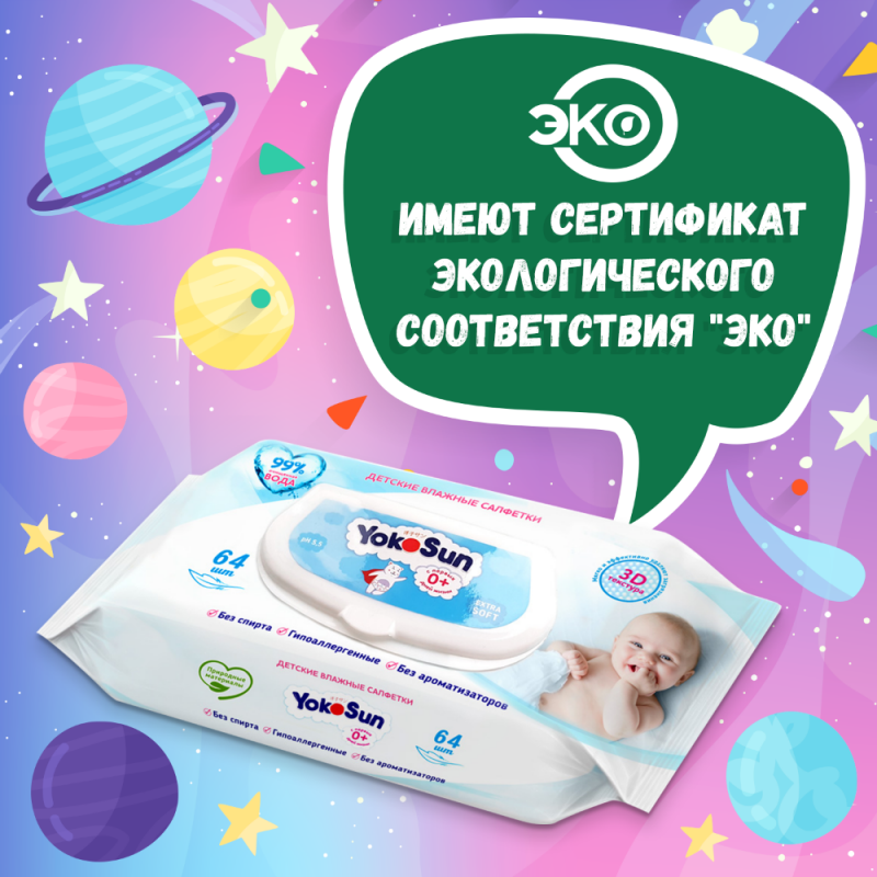 Детские влажные салфетки YOKOSUN , 64 шт