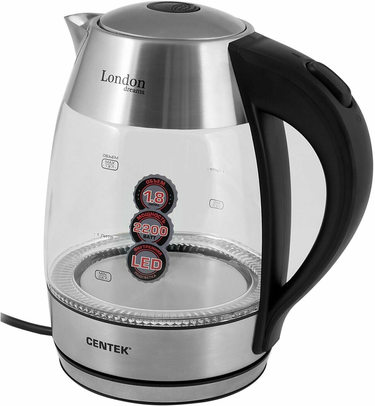 Купить Чайник Centek CT-0059 London, стекло, 1.8л, 2200Вт, LED-подсветка, отделка нерж.