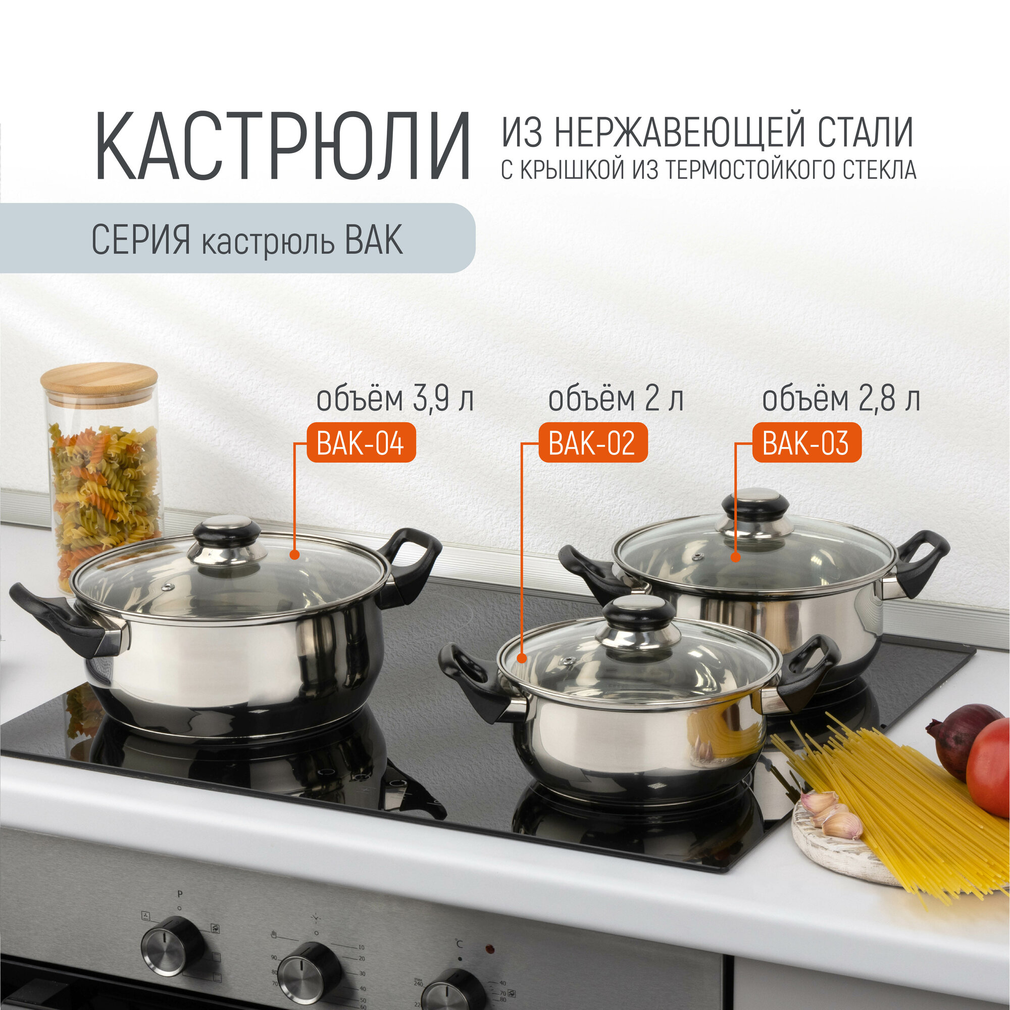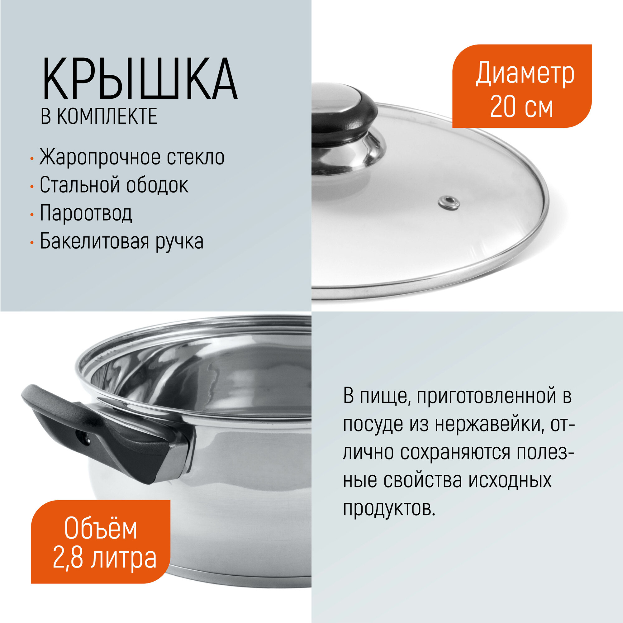 Кастрюля из нержавеющей стали с крышкой (стекло) BAK-03, 2,8 л