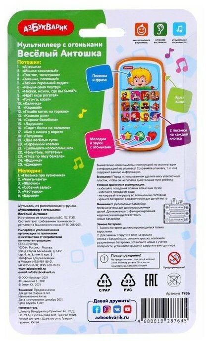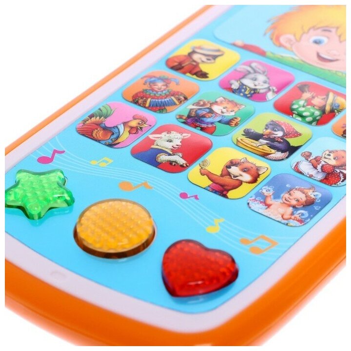 -Большое количество детских потешек и песенок. -Мерцающие огоньки на трех нижних кнопках, при том очень удобная панель. -Соответствие картинки на кнопке и смыслам песенок. -На одной кнопке по две песенки. На нижних кнопках различные звуки (по 6 на каждой) -Яркий красочный дизайн. -Удобно лежит в руке ребенка, тк на задней панели имеются нарисованные цифры и буквы, что создает шершавость и не дает выпасть из рук. -Очень достойная бюджетная цена для такой многофункциональной игрушки. -Динамик не громкий и не тихий, приятный слуху. -Есть кнопка вкл/выкл на боковой панели |
