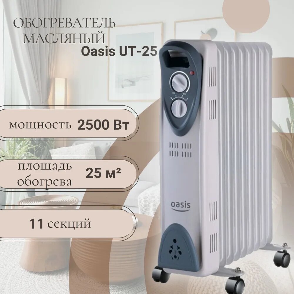 Радиатор масляный Oasis, модель UT-25, 2500 Вт, 11 секций, до 25 кв. м, обогреватель масляный, обогреватель для дома