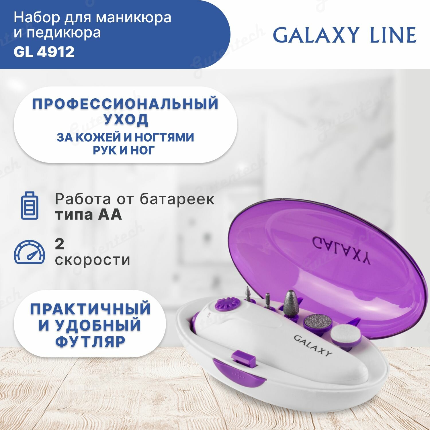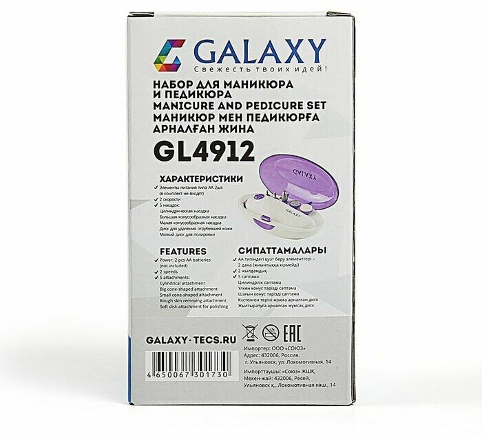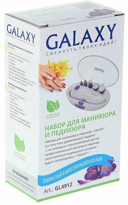 Galaxy Аппарат для маникюра Galaxy GL 4912, 5 насадок, 2хАА, бело-фиолетовый