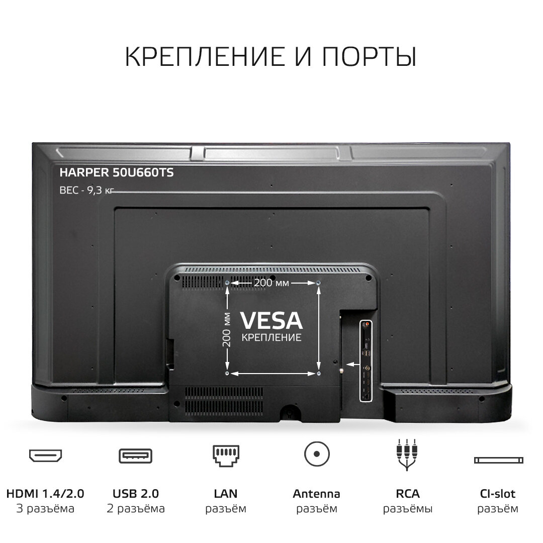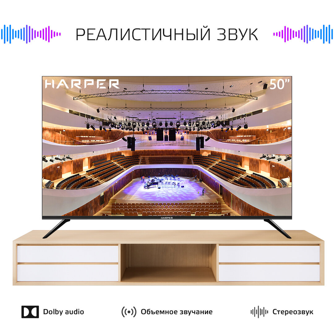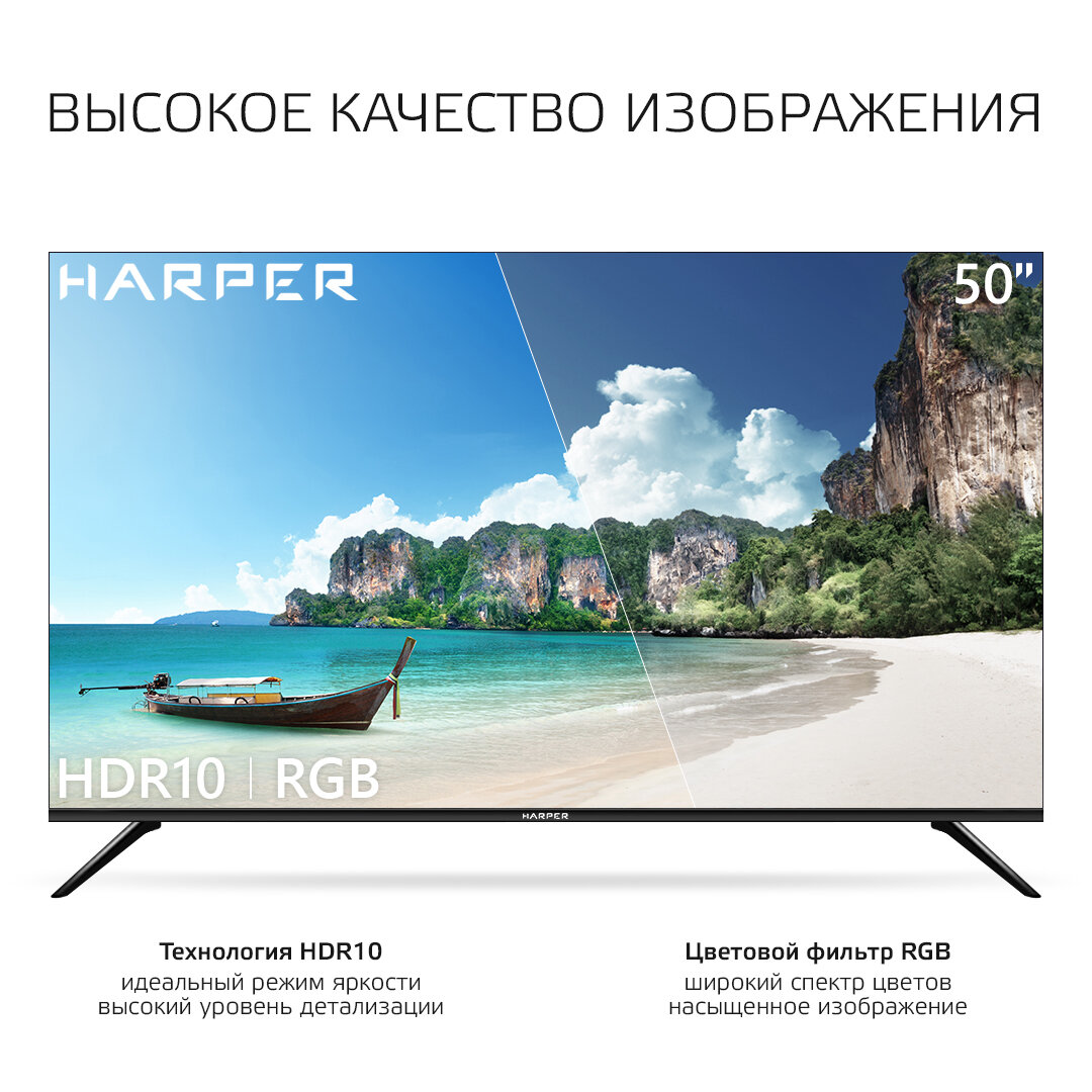 HARPER 50U660TS {Ultra HD 4K (3840 x 2160); Наличие цифрового тюнера: T2/S2; SMART; Габариты упаковки (ШГВ): 1126x250x686; Объем, м3: 0,1563; Вес, кг: 13,2}