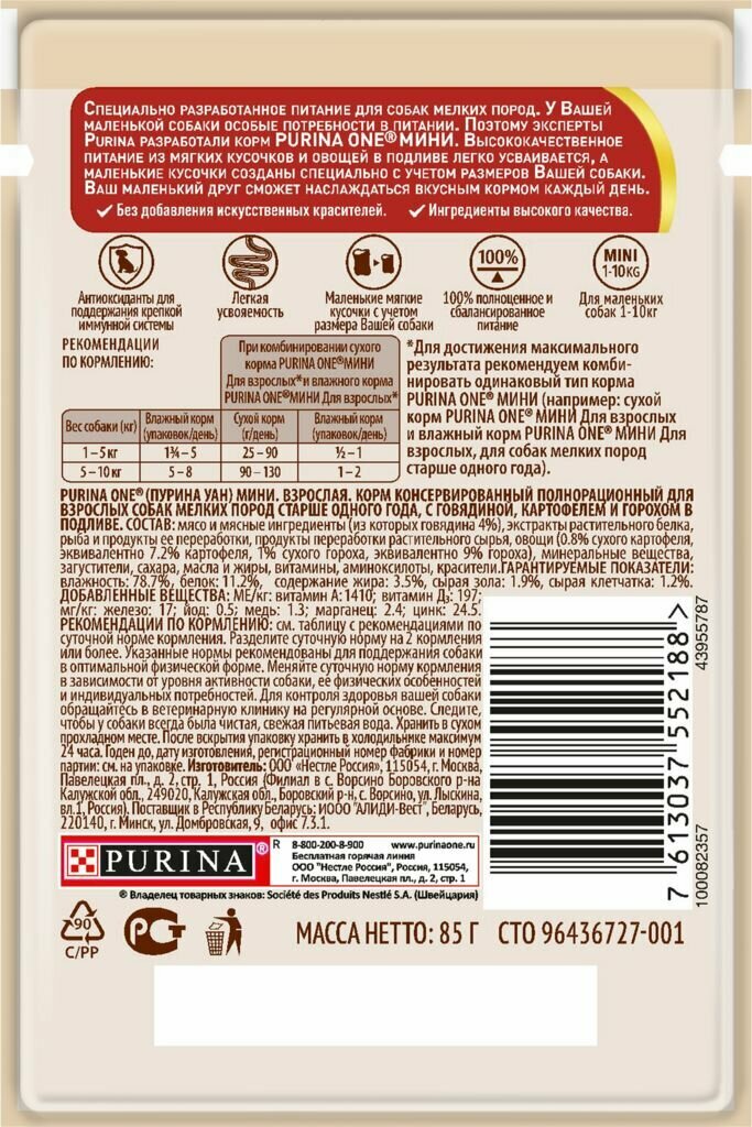 Купить Purina One Паучи для взрослых собак малых пород с говядиной картофелем и горохом в подливе Взрослая 1241698412453957 0,085 кг 41944 (10 шт)