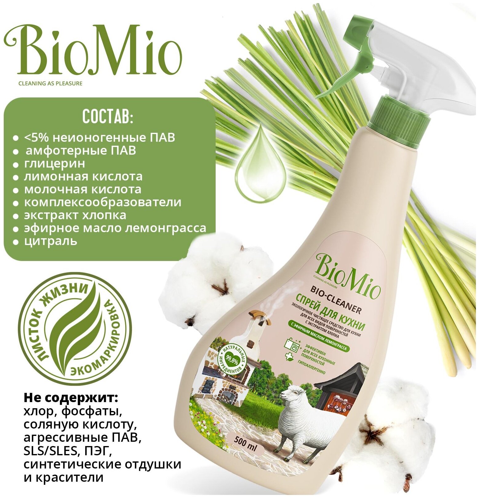 Чистящий спрей для кухни BioMio BIO-CLEANER с ароматом лемонграсса, гипоаллергенный, экологичный, 500 мл