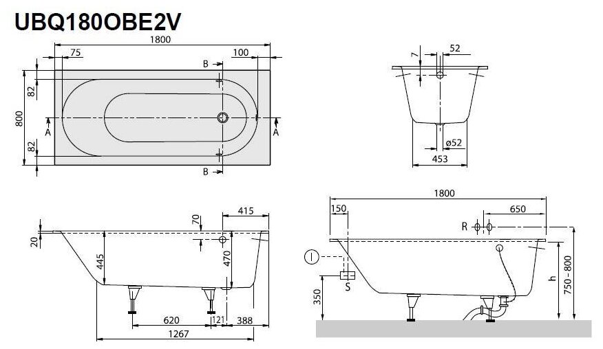 Ванна Villeroy & Boch OBERON Solo 180x80, с ножками, белая (UBQ180OBE2V-01)