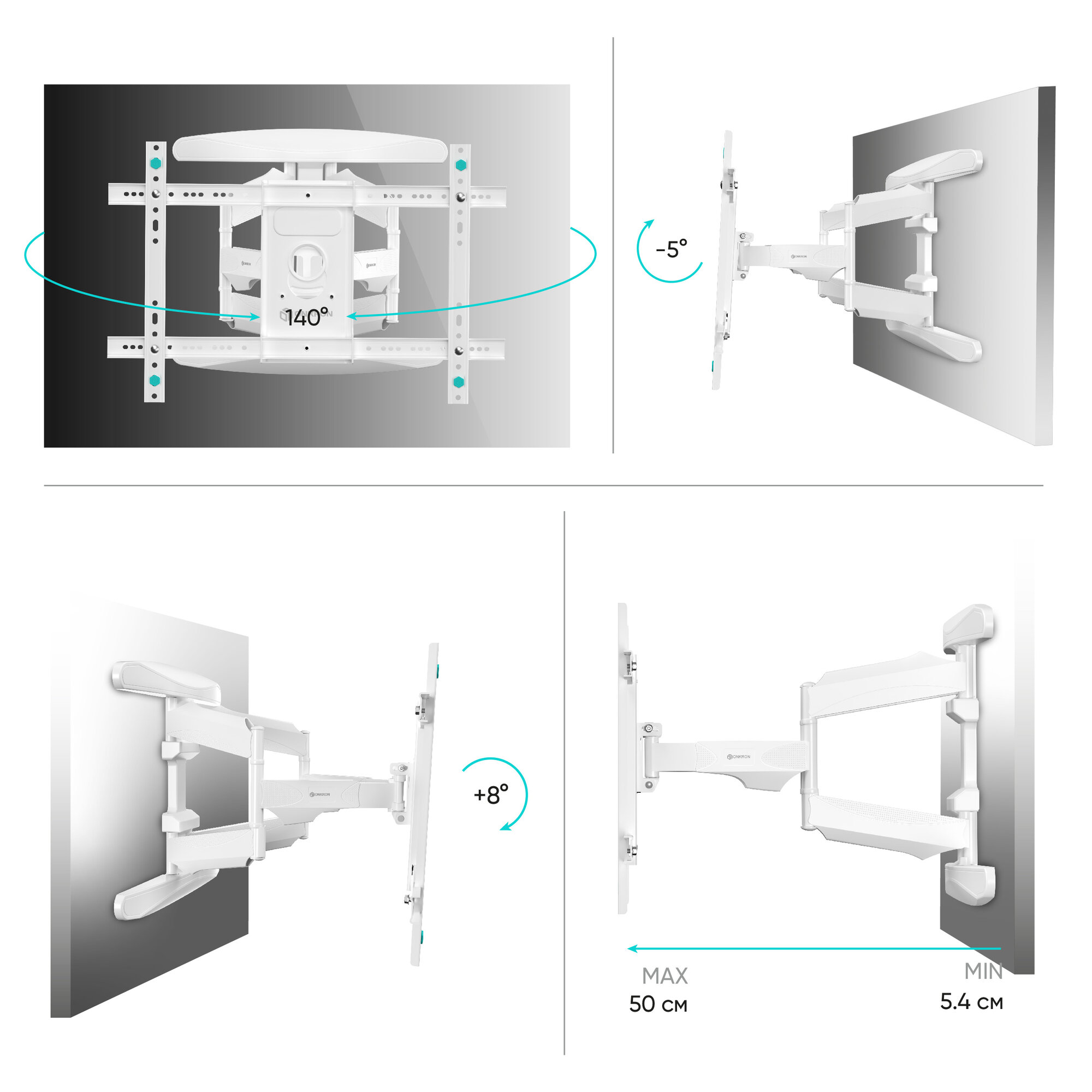 Кронштейн ONKRON/ 40-70 макс 400*600 наклон -5°/+8°, поворот ±140° Макс нагрузка 45,5кг, от стены 54-500мм, белый