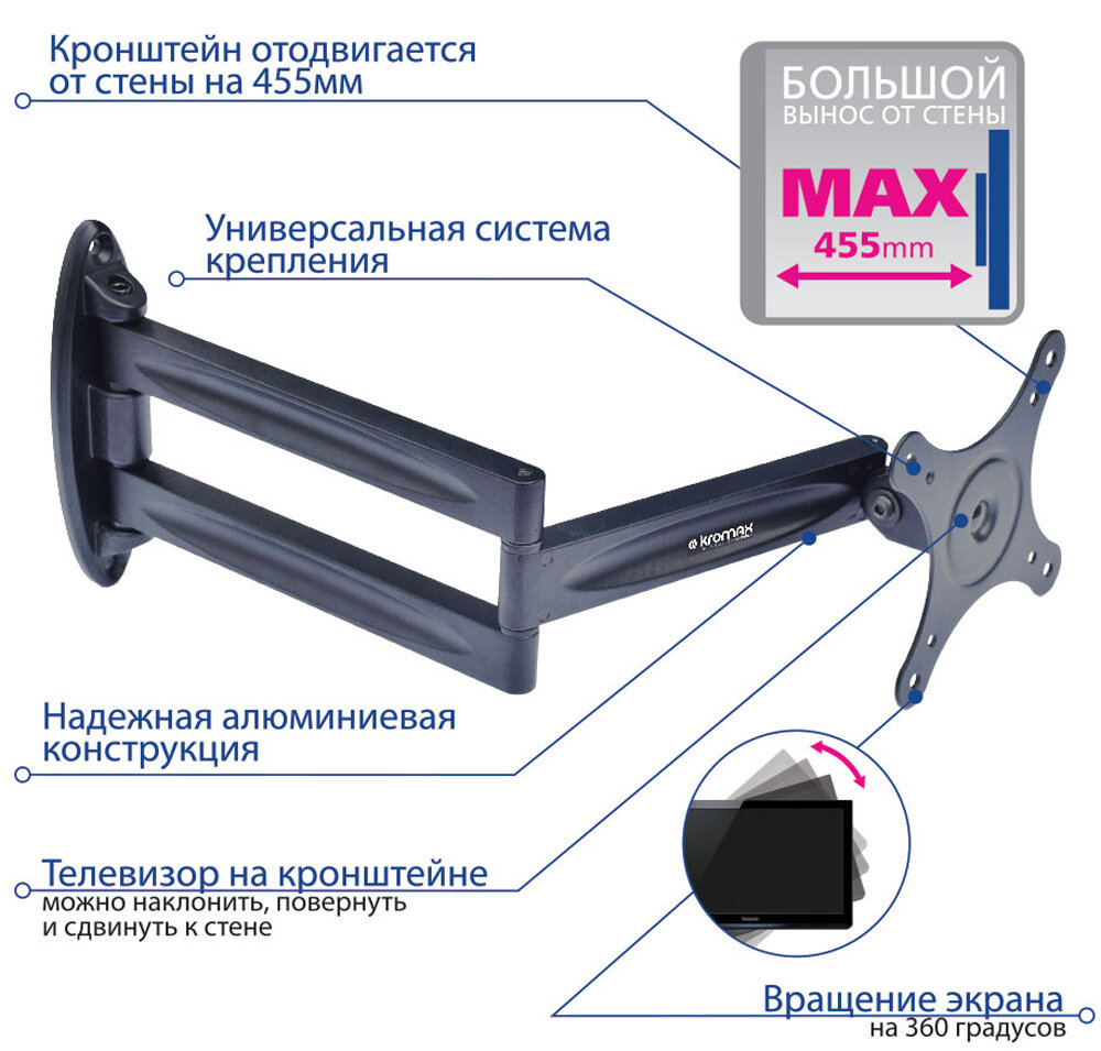 Ниже Вы можете прочитать отзывы на Кронштейн для телевизора Kromax TECHNO-11 черный 10"-32" макс.15кг настенный поворот и наклон, ознакомится с подробными характеристиками, посмотреть интересные обзоры и фотографии на Кронштейн для телевизора Kromax TECHNO-11 черный 10"-32" макс.15кг настенный поворот и наклон.