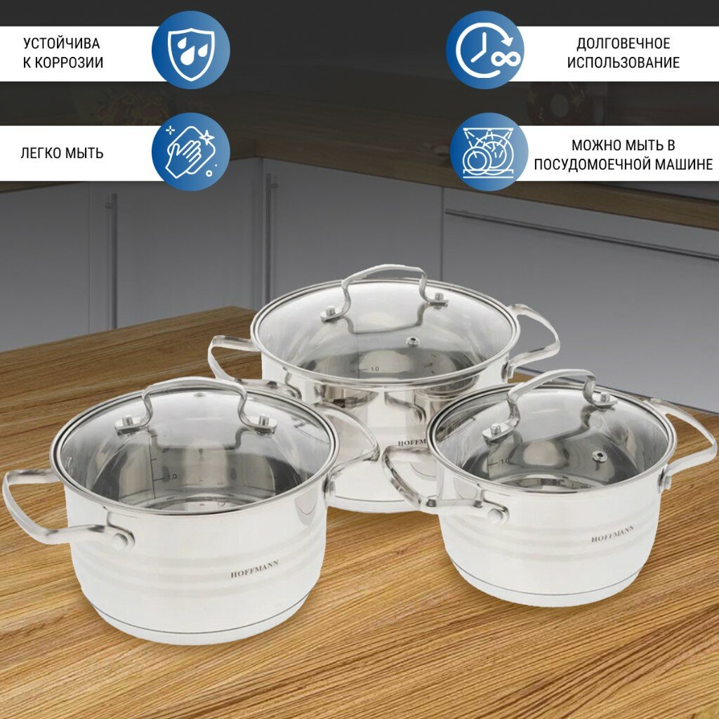 Набор посуды нержавеющая сталь, 6 предметов, кастрюли 2.1,3.1,4.1 л, индукция, Hoffmann, НМ 5106. 431122