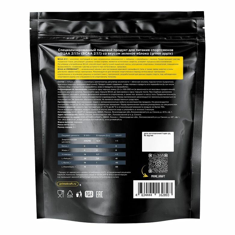 Купить Аминокислоты Prime Kraft BCAA 2:1:1 (зелёное яблоко), 500 гр.
