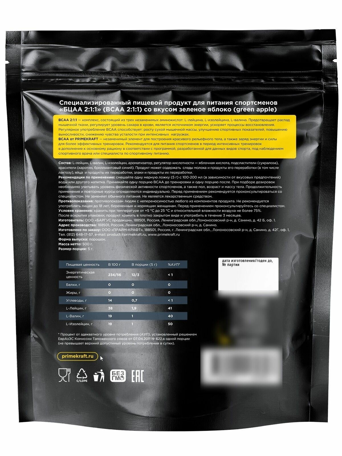 Prime Kraft BCAA 2:1:1 дойпак (500 гр.)_ Без вкуса