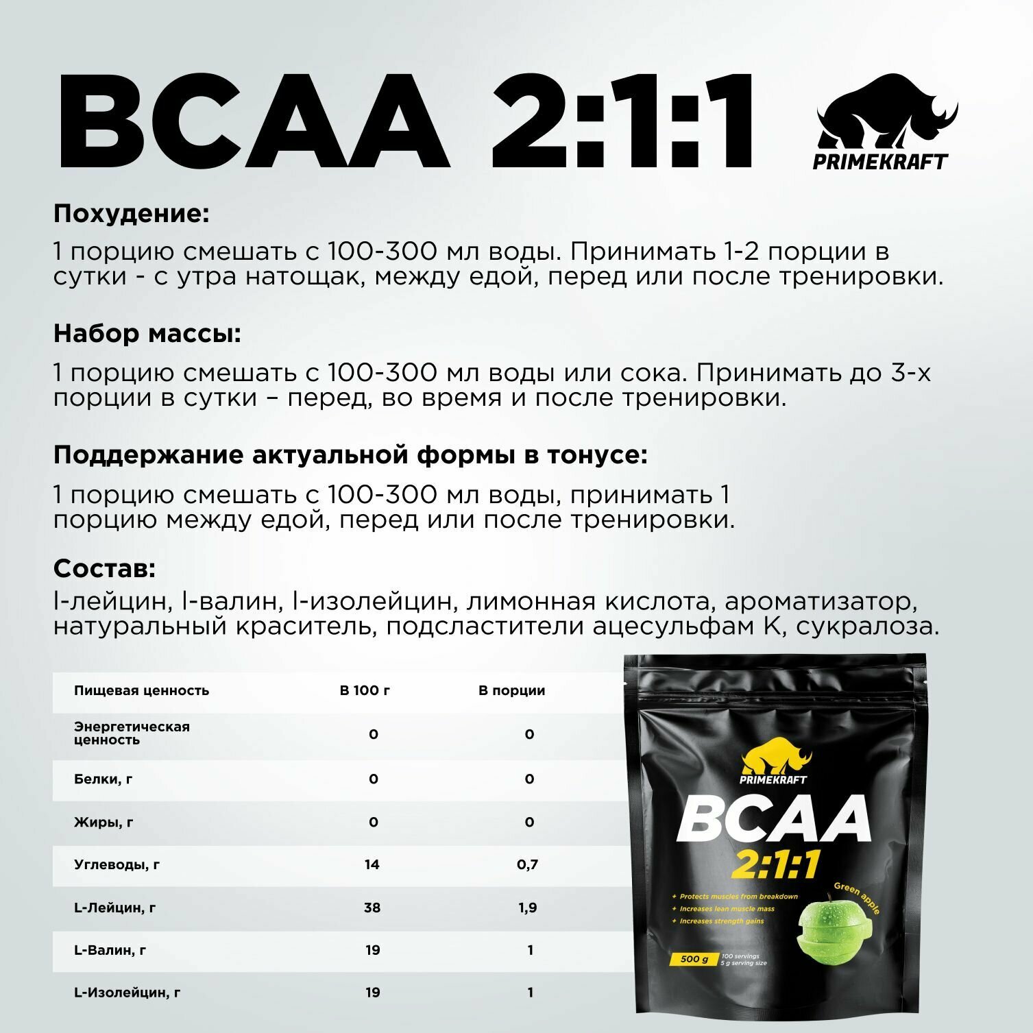 Аминокислоты PRIMEKRAFT BCAA 2:1:1 (БЦАА), Зеленое яблоко, 500 г / 100 порций