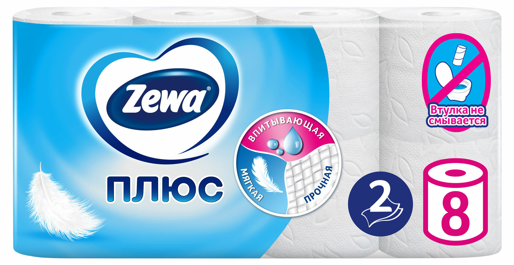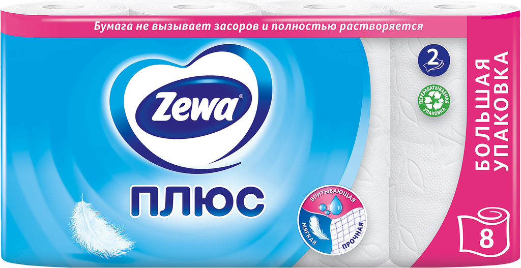 Туалетная бумага Zewa Плюс Белая, 2 слоя, 8 рулонов
