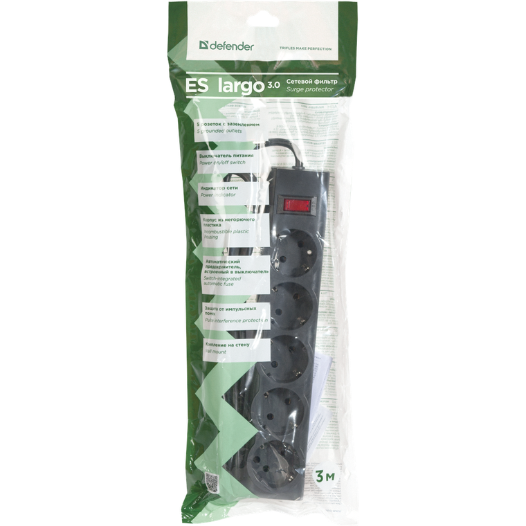 Сетевой фильтр Defender ES largo 3,0 м, черный, 5 розеток (пакет) 99498 Сетевой фильтр Defender ES l .