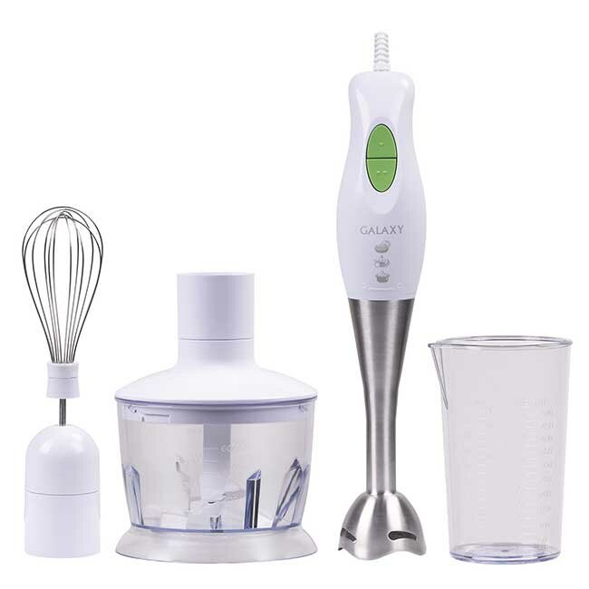 GALAXY LINE GL 2122 Блендерный набор мощность 300Вт, 2скорости работы, насадка венчик, мерный стакан объемом 500мл, насадка блендер из нержавеющей стали, насадка – измельчитель объемом 500мл, подвесная петля, книга рецептов, 220-240Вт 50Гц