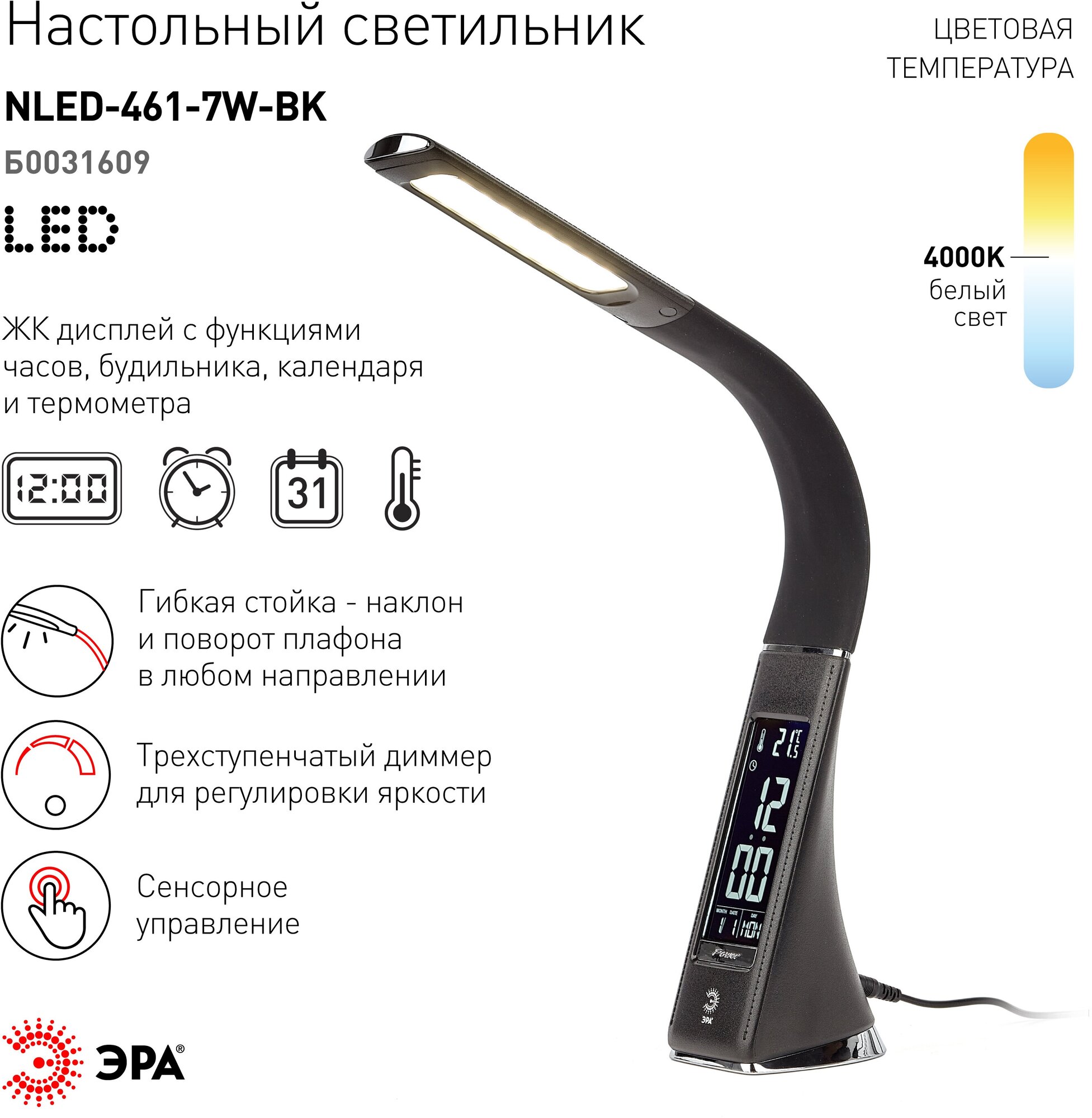 Офисная настольная лампа светодиодная с диммером и выключателем термометром будильником и часами NLED-461-7W-BK (ЭРА)