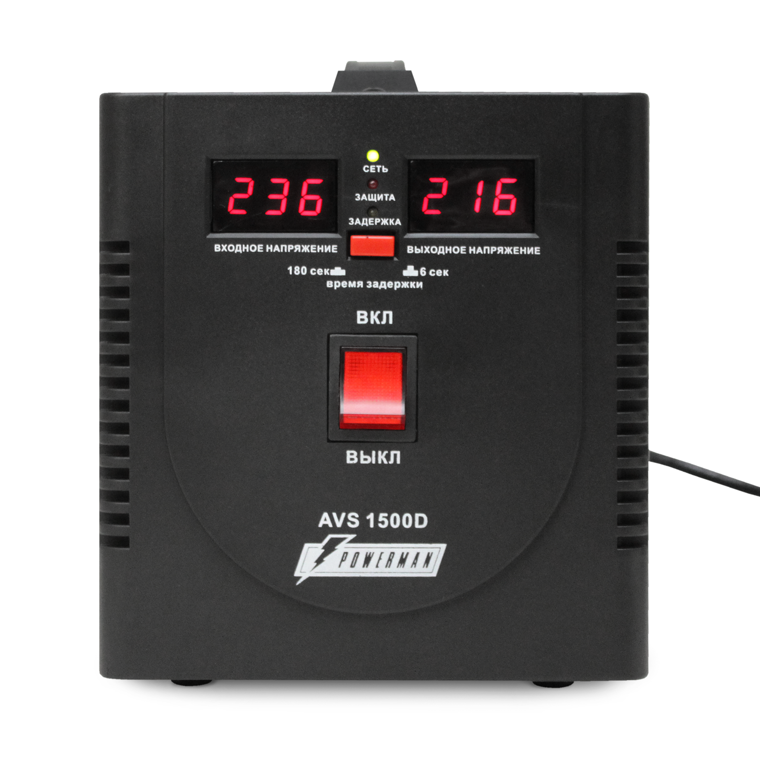 Стабилизатор POWERMAN AVS 1500D, черный, ступенчатый регулятор, цифровые индикаторы уровней напряжения, 1500ВА, 140-260