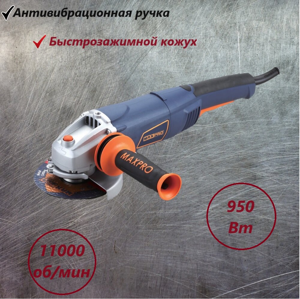 Шлифмашина угловая / болгарка 950 Вт; 11000об/мин; быстрозажимной кожух 125мм; антивибрационная ручка. MAX-PRO